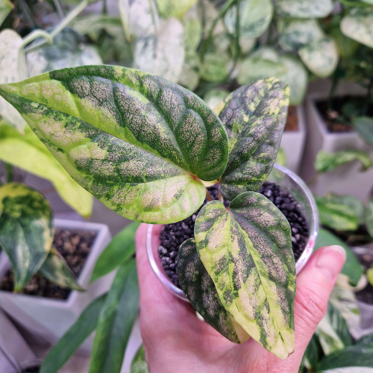 Wyjątkowa propozycja dla miłośników roślin kolekcjonerskich! Piper sylvaticum Tricolor zachwyca efektownymi liśćmi ozdobionymi trójkolorową variegacją, w której przeplatają się odcienie zieleni, kremu i delikatnych, jasnych akcentów. Każdy liść jest niepowtarzalny, co sprawia, że roślina stanowi prawdziwą ozdobę każdej kolekcji.